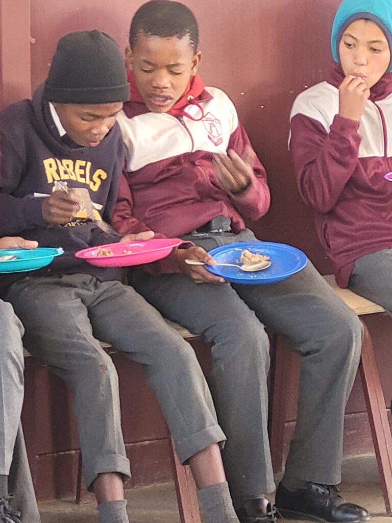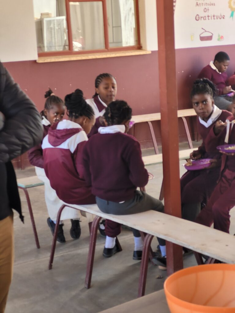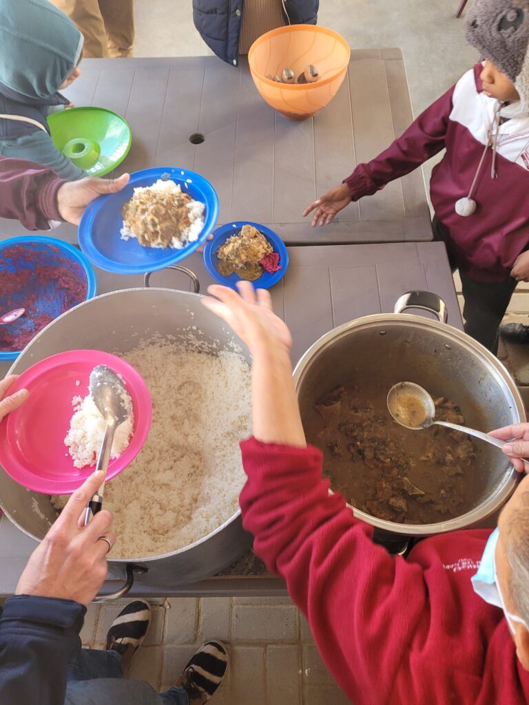 Un so fand ich mich hinter einem riesigen Topf mit Reis und vor einer langen Schlange geduldiger Kinder, die jeder einen Teller bekamen. Gestärkt konnten sie danach wieder in den Unterricht gehen: Mit Energie lernt es sich leichter als mit knurrendem Magen.