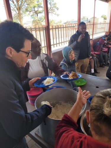 Un so fand ich mich hinter einem riesigen Topf mit Reis und vor einer langen Schlange geduldiger Kinder, die jeder einen Teller bekamen. Gestärkt konnten sie danach wieder in den Unterricht gehen: Mit Energie lernt es sich leichter als mit knurrendem Magen.