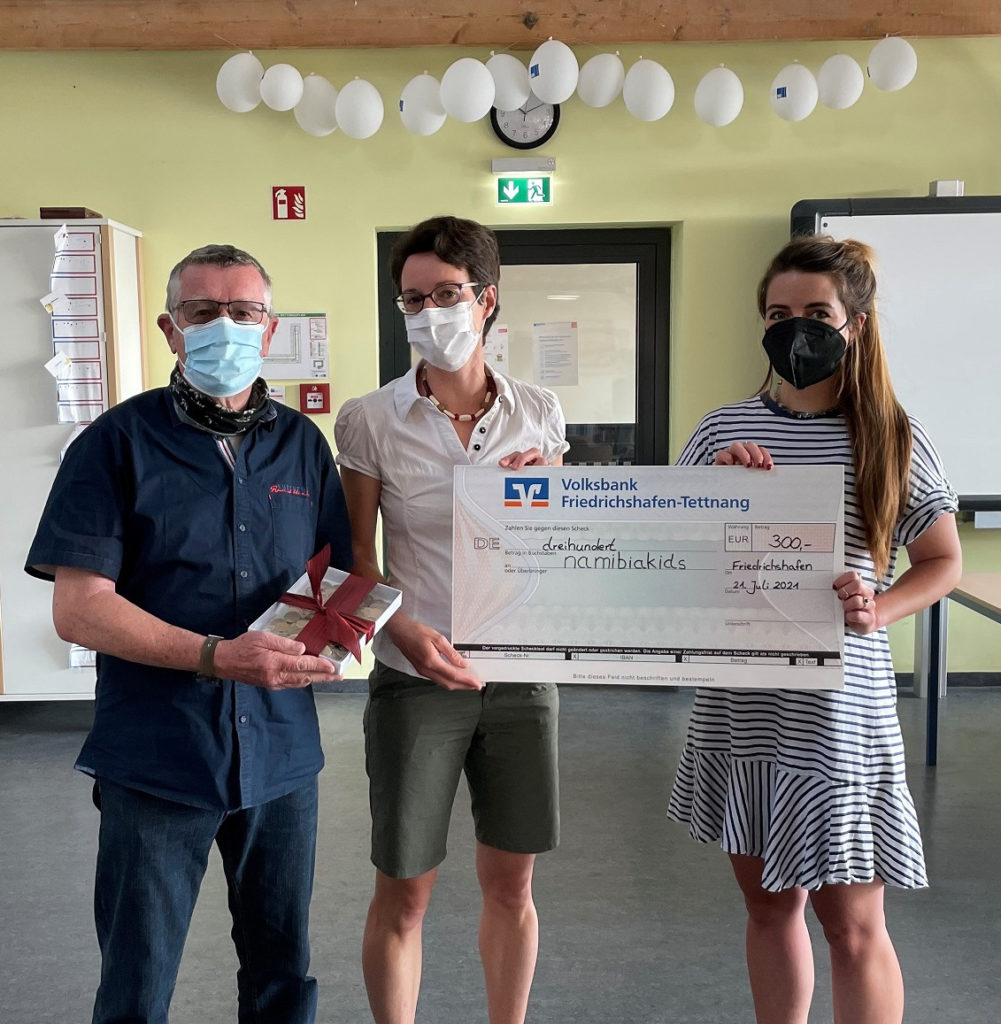 Wir bedanken uns ganz herzlich für die super Idee, die gute Umsetzung und Durchführung und für eine fröhliche Spendenübergabe mit jubelnden Schülerinnen und Schülern (die wir hier aus Datenschutzgründen aber nicht mit auf dem Foto haben).